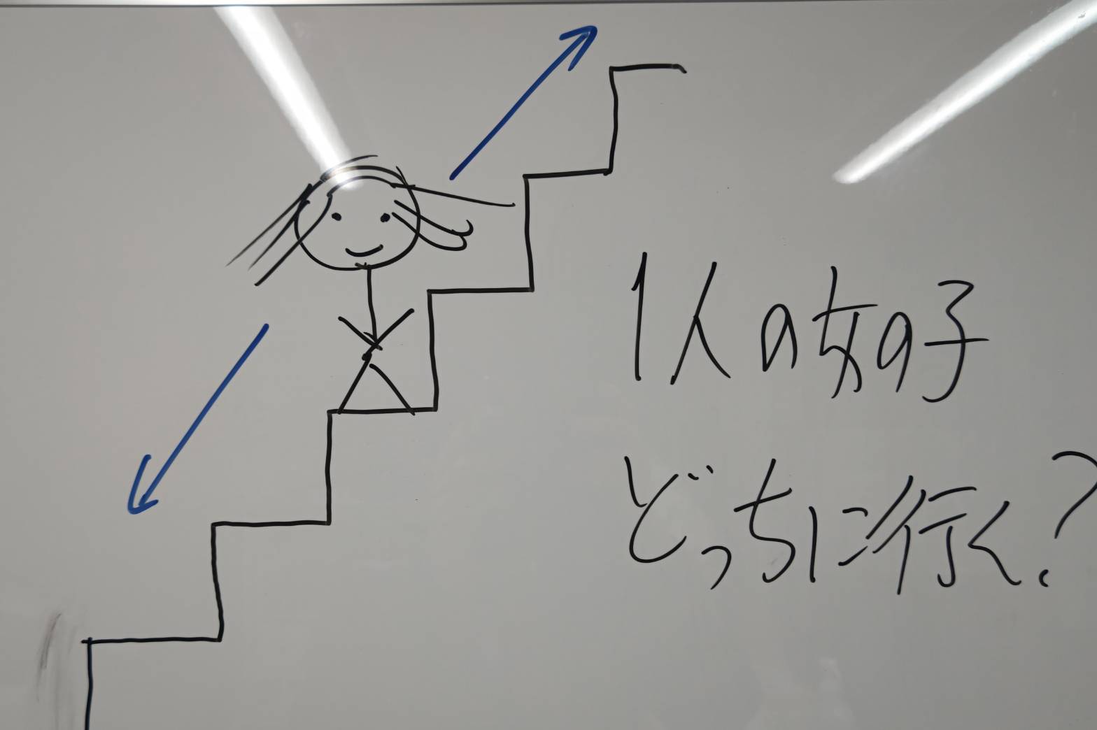 一人の女の子が階段にいます。上か下のどちらに行くでしょうか?