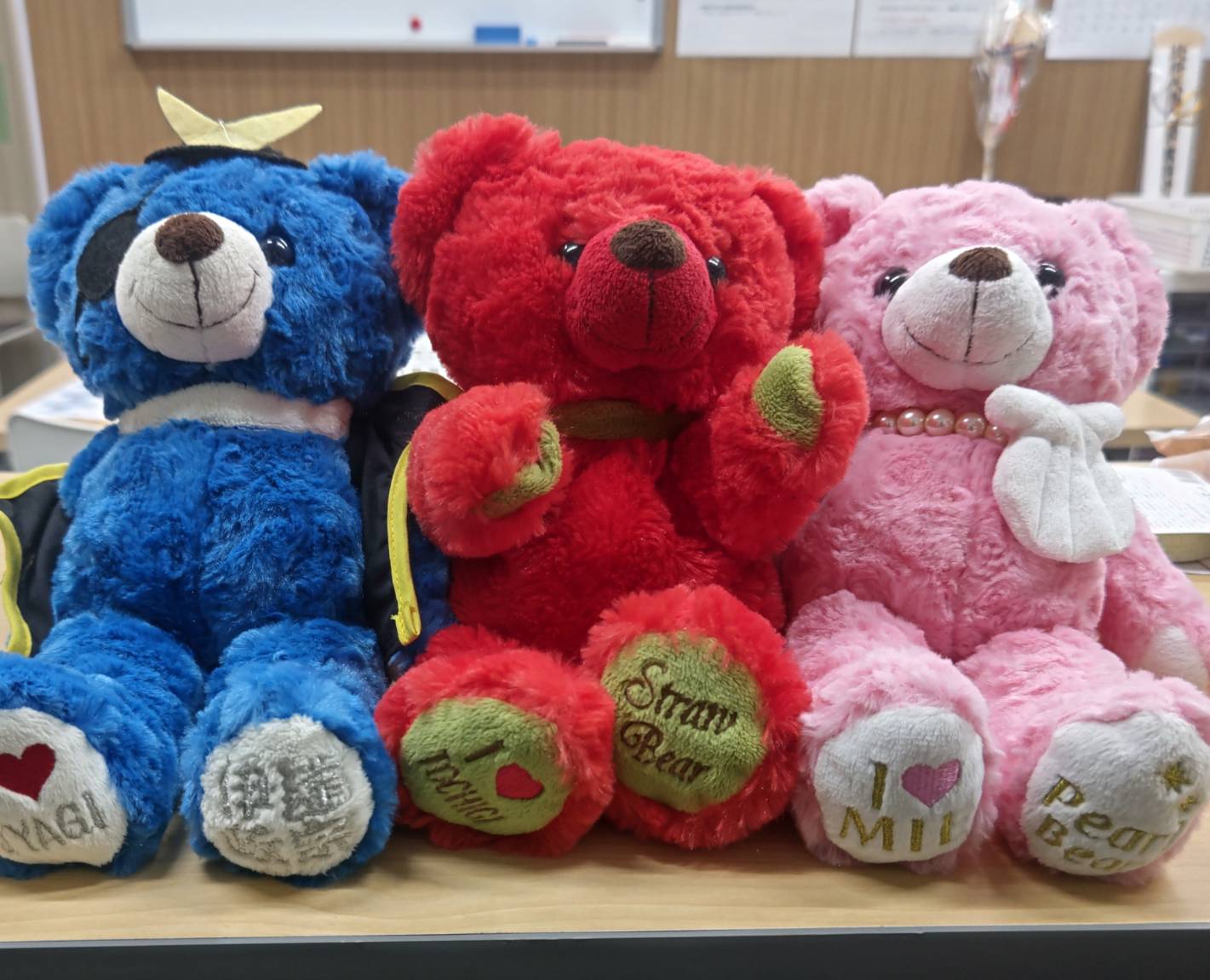 受付には仙台の伊達政宗ベア(青)、栃木のストロベア(赤)、三重のパールベア(桃)がお出迎えしています。足をみてください!!!