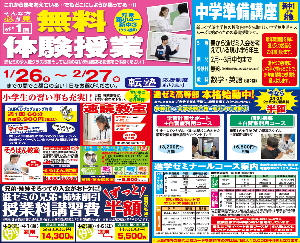 小学生・中学生・高校生 各校舎先着 各5名様ずつ限定