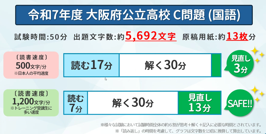 合わせて入試問題等の文章量も多くなっており、令和7年度の大阪府公立高校の受験問題ではおよそ原稿用紙13枚分の問題が出ました。日本人の平均読書速度だと読むだけで17分も取られてしまいます。